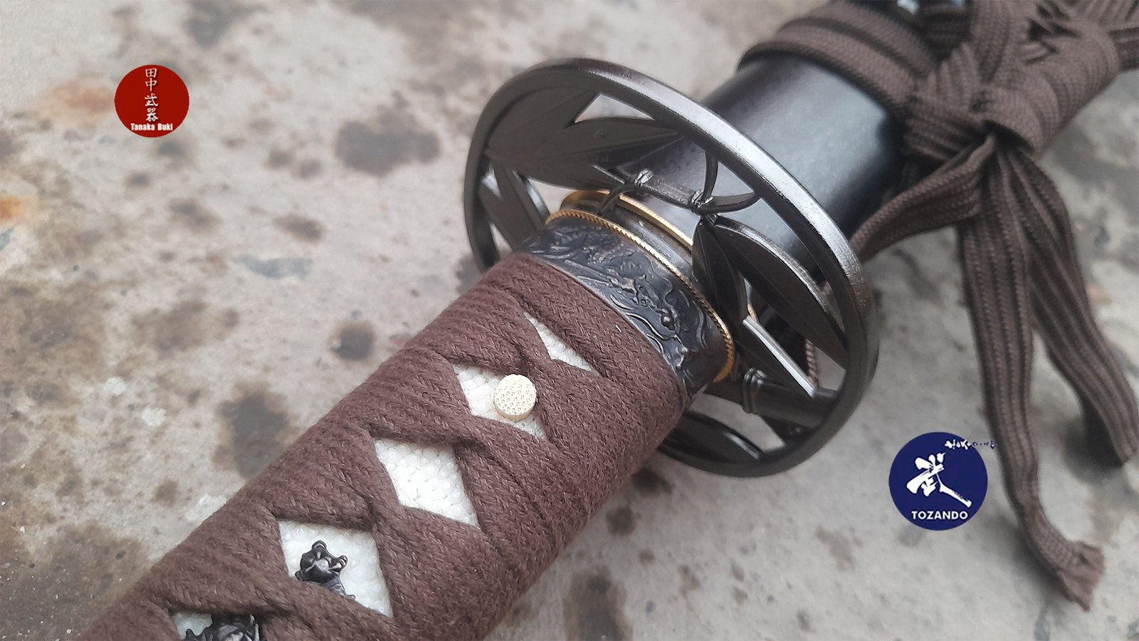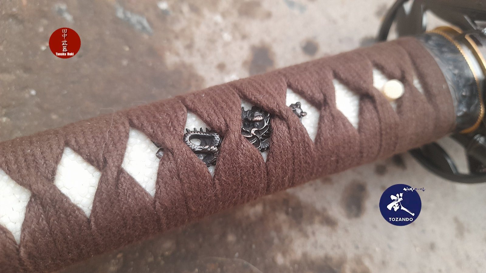 ito Japones de algodón marron, samegawa original natural, fuchigashira y Menuki con motivo de Dragon.